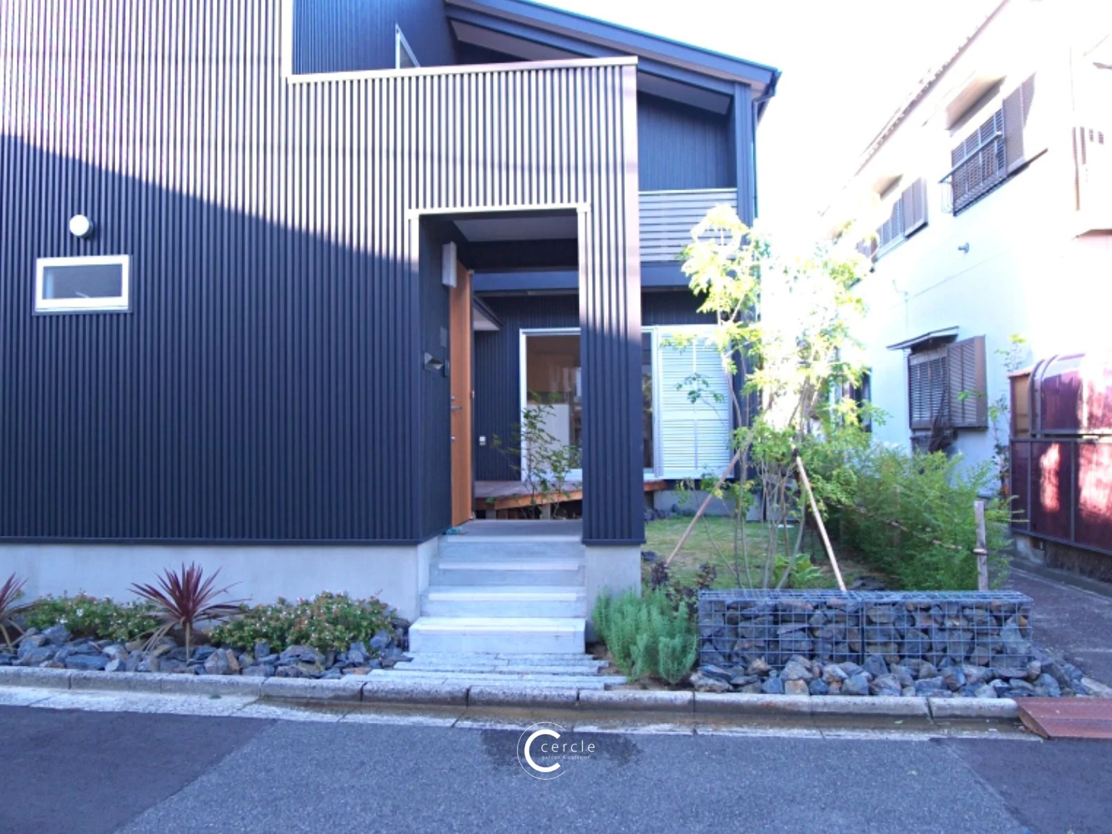 ガビオンが目を引く野趣あふれるロックガーデン風エクステリア【新築外構】