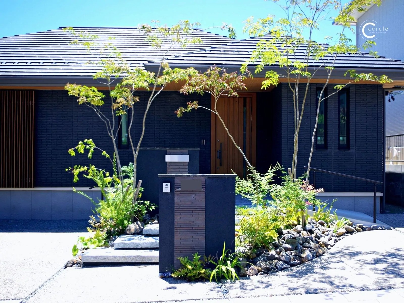 外から家の中はもちろん、お庭全体も見えない完全クローズド外構。その上、玄関前のステップ・タイル・門扉をわざとずらして配置することで、より中が見えにくい、防犯性の高いデザインになっています。