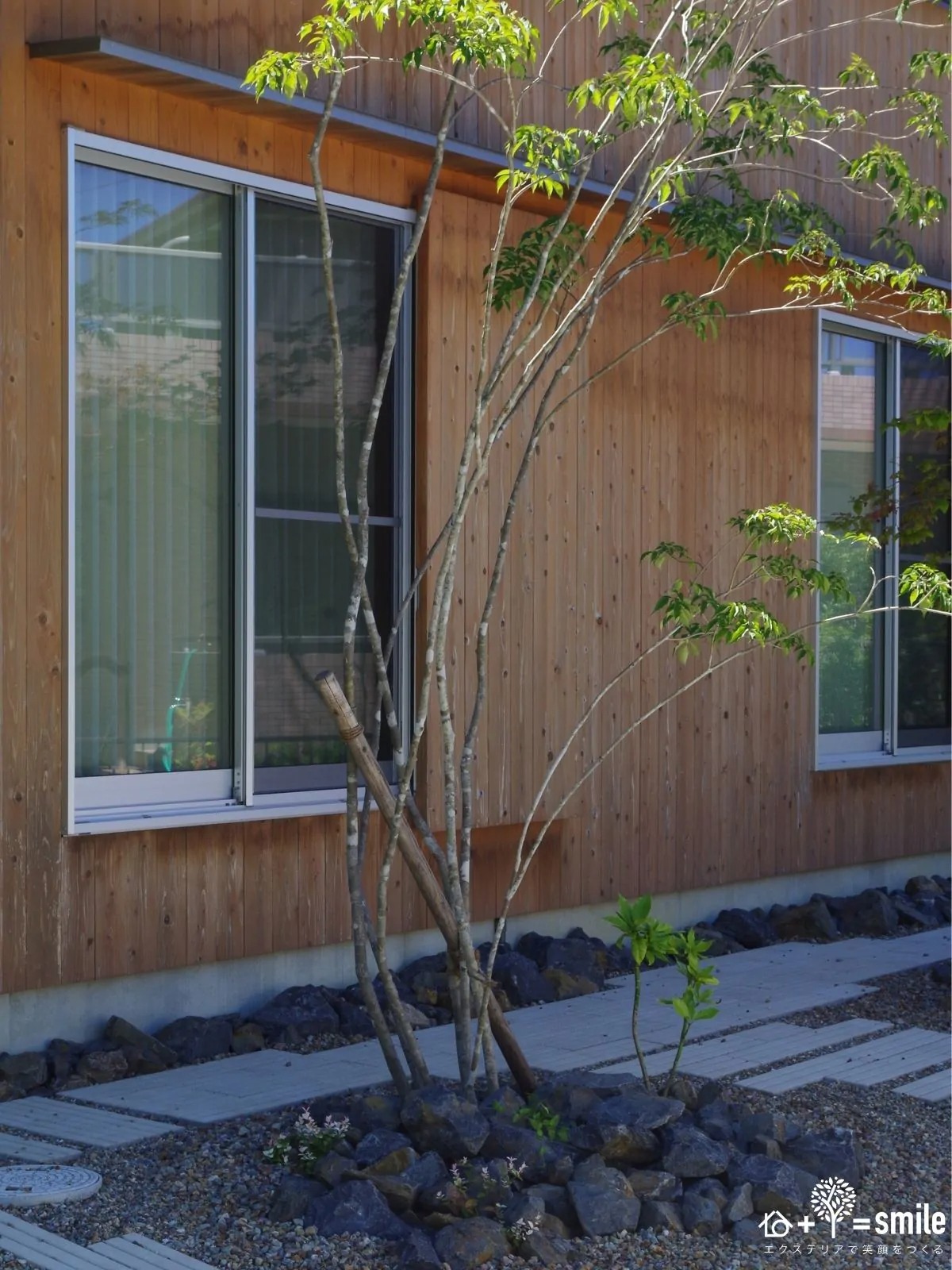 窓の前には、アオダモ。目隠しの効果はもちろん、窓の前の路地風の通路を彩ります。