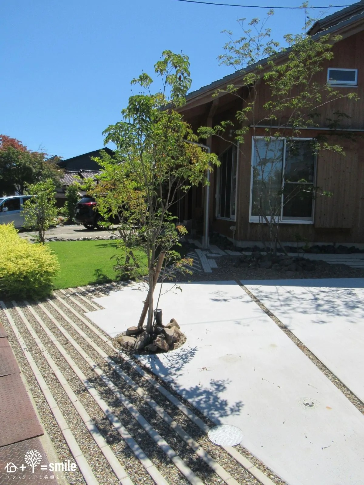 シンボルツリーをを活かした開放的なのに家の中が見えないお庭