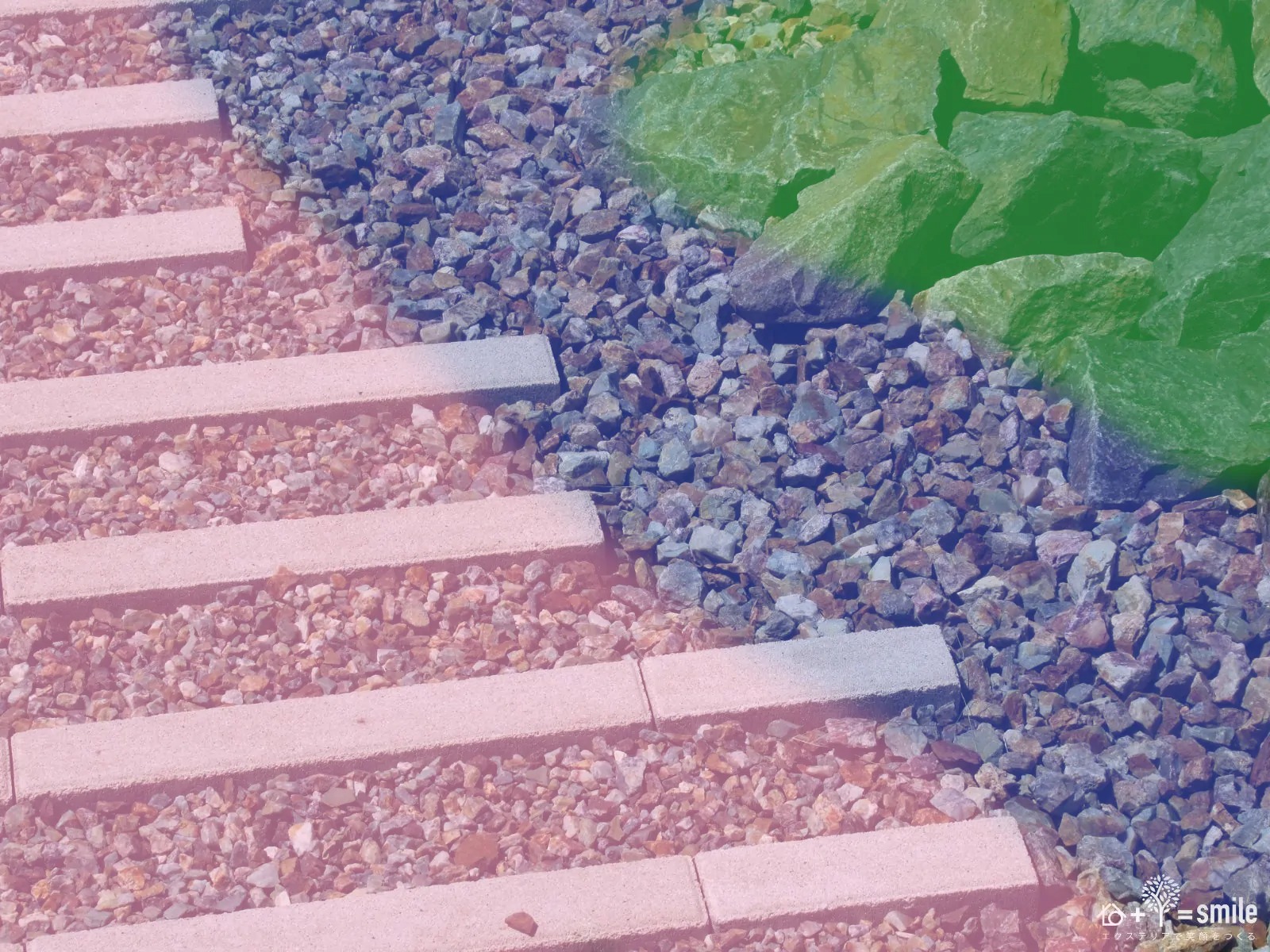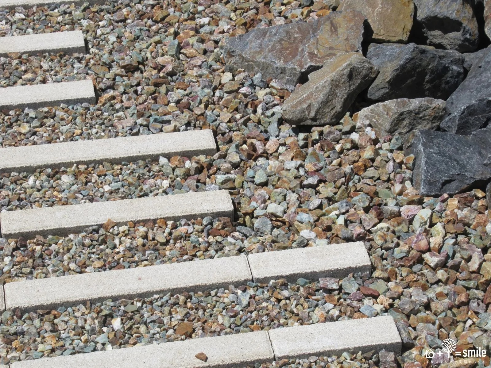 「色」ではなく砂利の「粒の大きさ」を段階的に変えて、野山のような石の粒感を表現いたしました。さらに割栗石と組み合わせることで、人工的な雰囲気を削ぎ落としています。