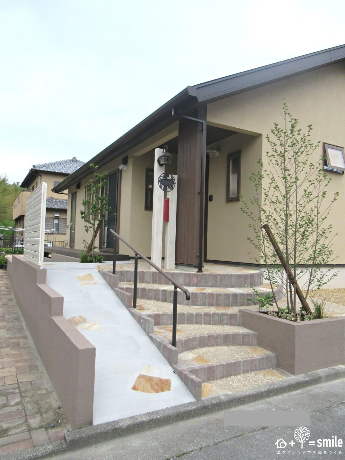 アプローチの裏手に伸びたスロープは、足腰に負担が掛からないよう緩やかな勾配となっております。なぜ玄関から正面に向かってではなく、裏手に伸びているのかというと理由は2点。まず、正面に向かってもスロープを付けていますが、正面側は距離を確保できずどうしても急勾配なスロープしか設置することができません。次に足が不自由なご家族が、車から降りた後スムーズに玄関へ行けるような導線を考えた場合、裏手側にスロープがあった方が通行人との接触や事故も少なく、安心して出入りができます。 ではなぜ正面にもスロープを作ったのか。こちらのスロープは愛犬の出入りをしやすいようにと設置したスロープなんです。 スロープといっても、目的に合わせて長さ、勾配、大きさ、デザインが変わります。予算や条件的に完璧に適えることができない事例も多いのですが、今できる最適案を一緒に考えさせていただきます。