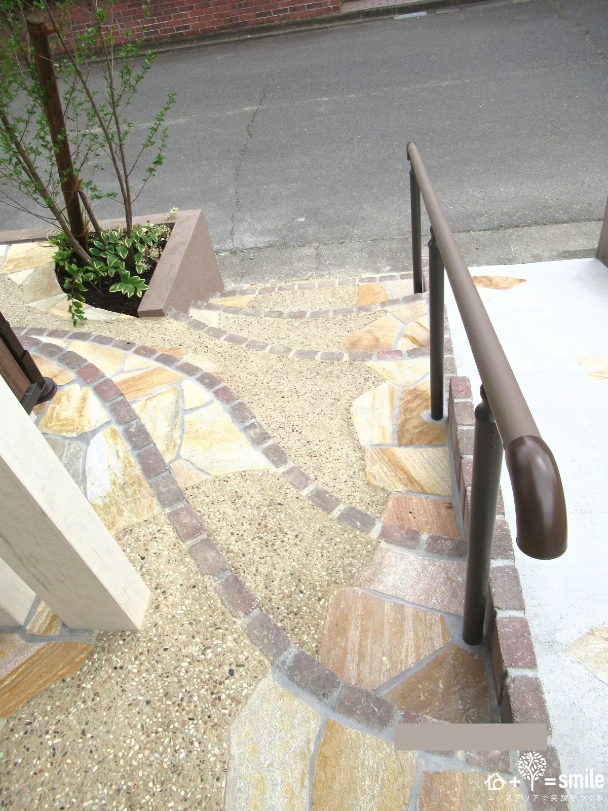 外構工事でつくる場合は、玄関ポーチの形や素材はもちろん、玄関のアプローチ階段の段数、高さ、デザインも自由に設計にできます。また、アプローチ階段を均等な高さで作ることもできるんです。(住宅工事の際に2~3段の階段を作って、後から外構工事で階段をさらに付け足す場合、均等な高さの階段を作ることはできなくなります。)