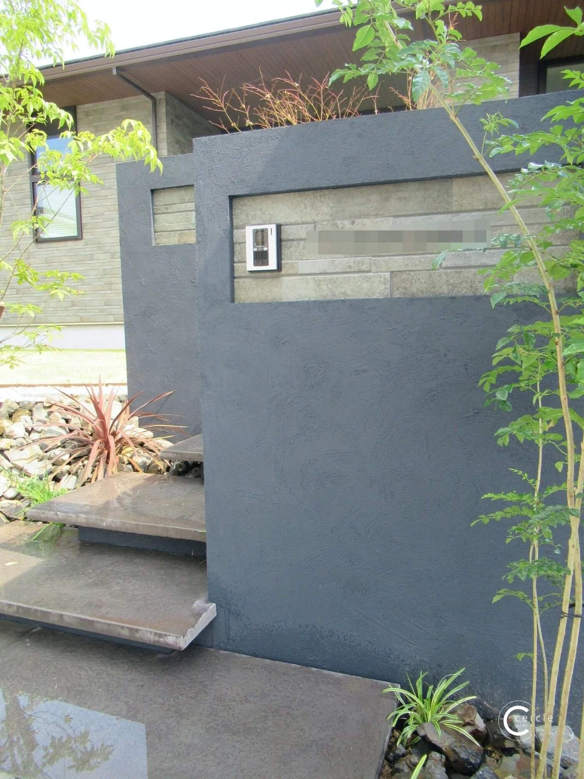 蹴込み部分を黒、平板部分にTOYOのダルストーンペイブ/クロサビを使用することで、階段が空中に浮いているような錯覚を起こすデザインとなっております。美しい石の風合いもあって、ナチュラルな印象は損なうことはありませんが、同時に洗練された印象も感じることができる大変美しいアプローチです。