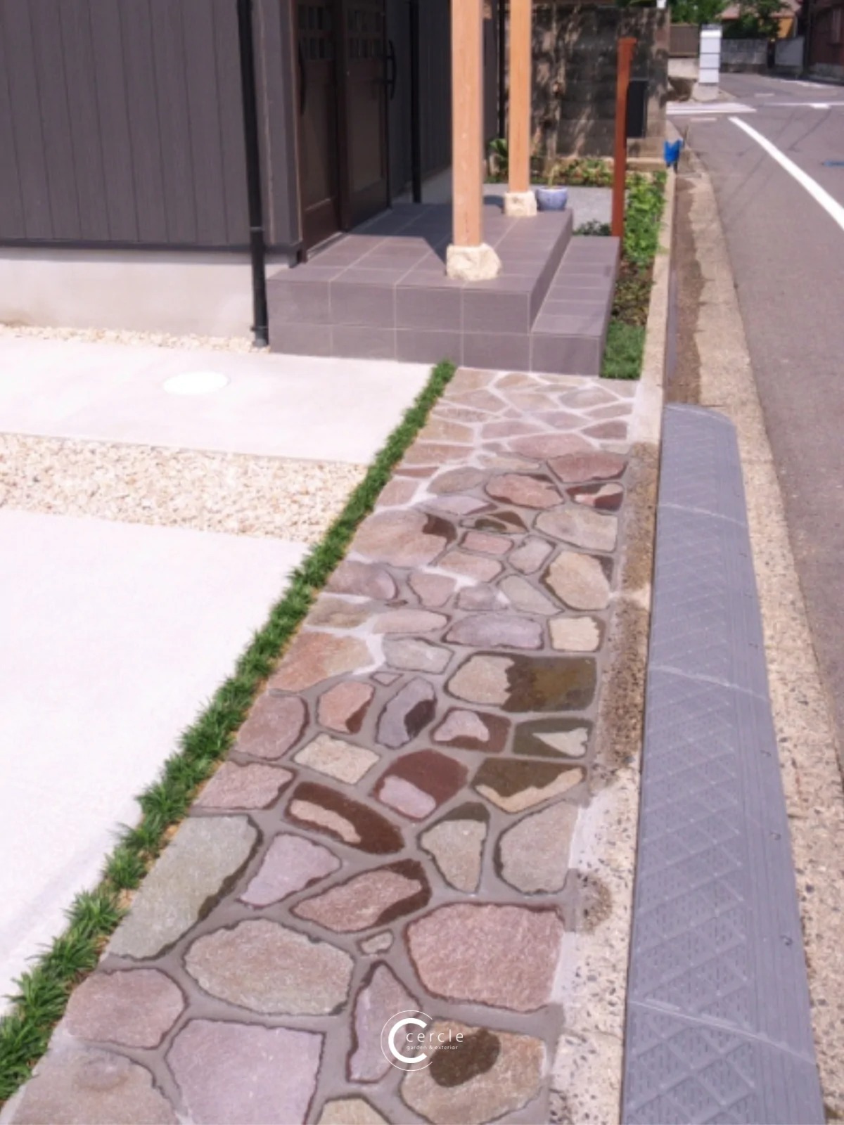 和風の見せどころとして、駐車場入口の床面には自然石の乱張り仕上げです。Pointポイント②