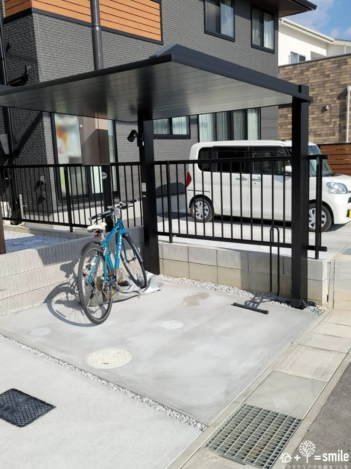 自転車の駐輪スペースにも、カーポートSCを取り入れています。こちらは木目調ではなく、黒一色のものを使用しています。まったく同じものではなく、統一感のある別のカラーを取り入れることで、自然なアシンメトリーさを生み出します。