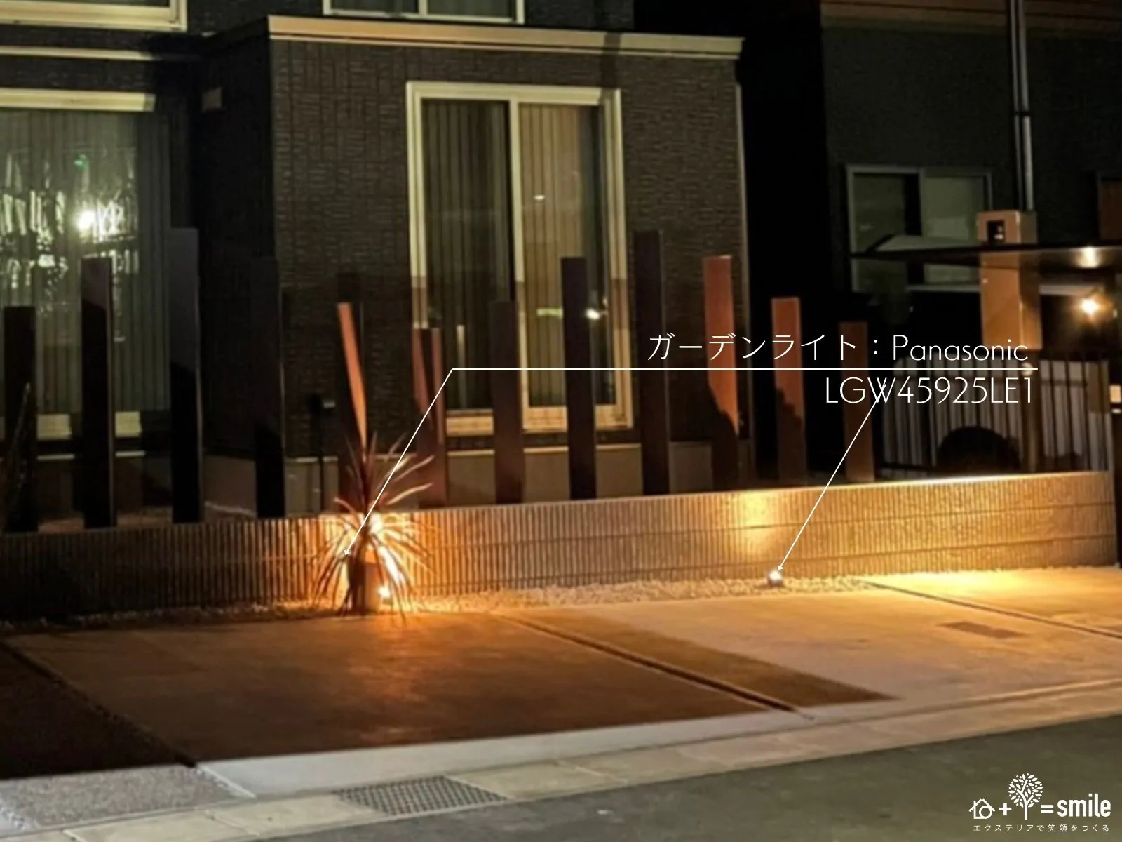 ガーデンライト。下から上を照らすアップライト。おしゃれな演出をすると同時に、夜間の駐車時の安全性アップ。