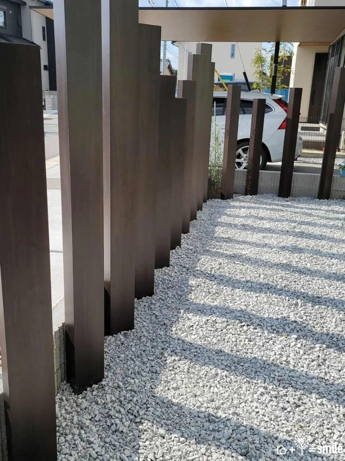 フェンスや塀を建てるかわりに、ランダムな高さの木目調の角柱を並べて駐車場と中庭を区切っています。カーポートの木目に合わせた色調、質感の角柱を使ったお洒落な演出。とはいえ、目隠し効果はないように思えるかもしれませんが……角柱がフォーカルポイント(注目点)となってくれているので窓や室内に通行人の視線が向かいにくくなるという効果があります。